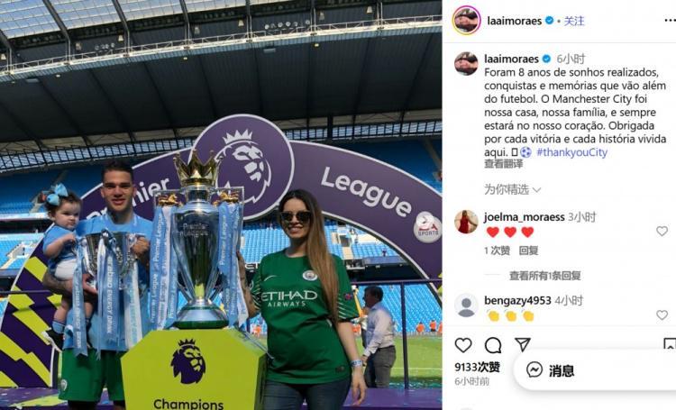 直播吧9月3日讯 在埃德森加盟费内巴切后,他的妻子也发文告别了曼城。
